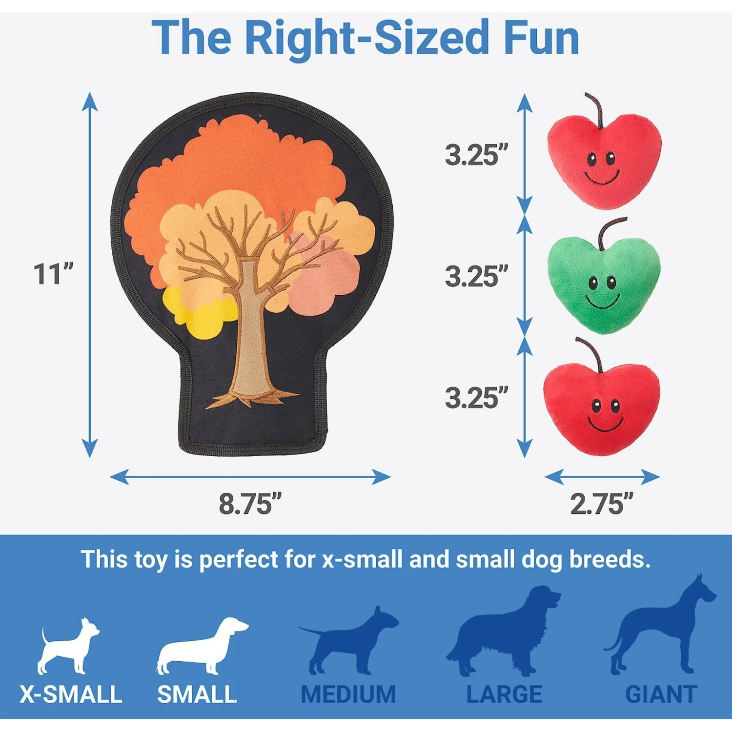 - Features crinkle paper and a total of seven squeakers in the apples and tree.